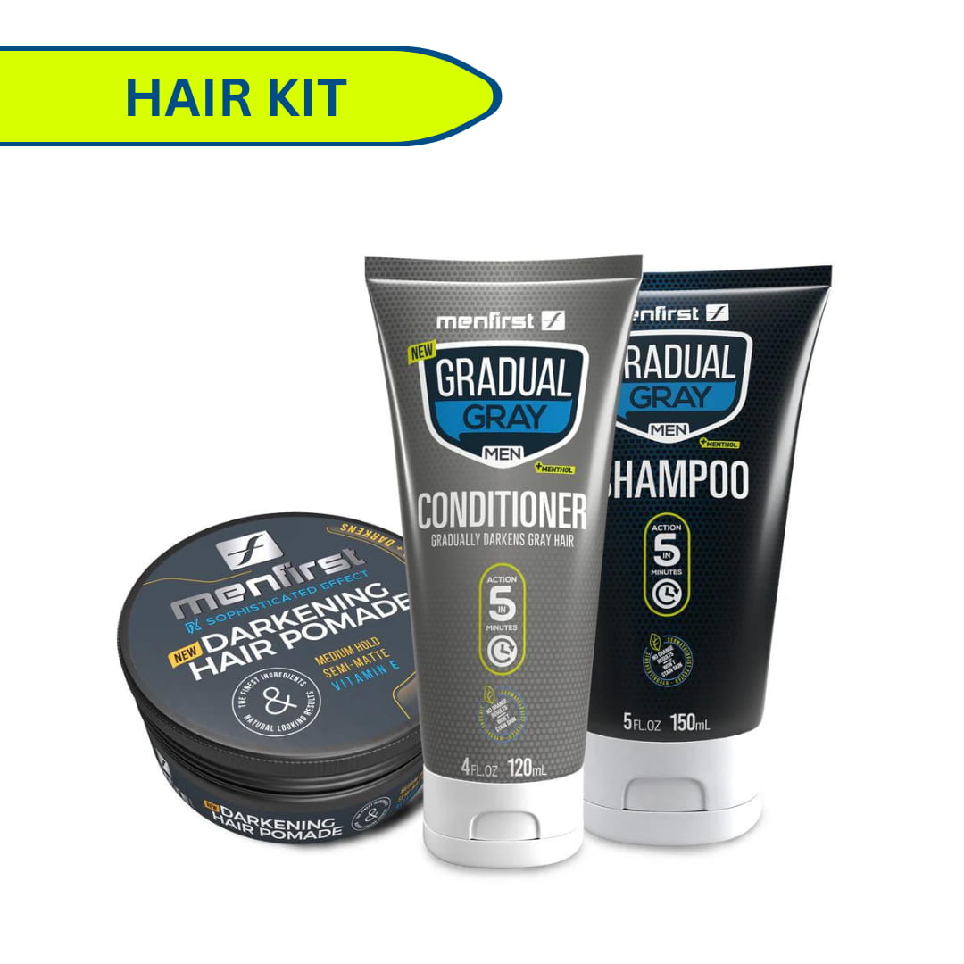 Menfirst Gradual Gray - Good Bye Gray Hair- 3-in-1 Shampoo + Conditioner & Darkening Pomade - 3 Pack Bundle