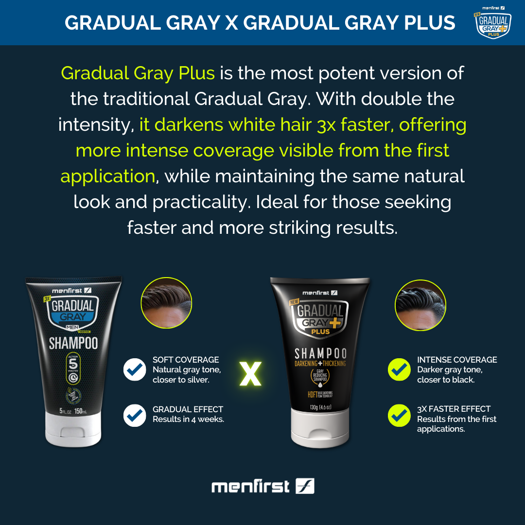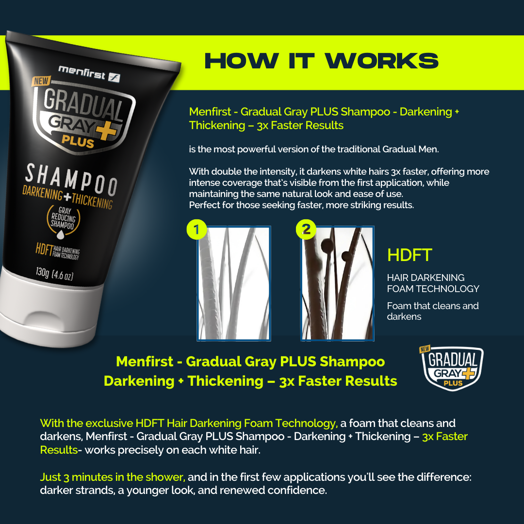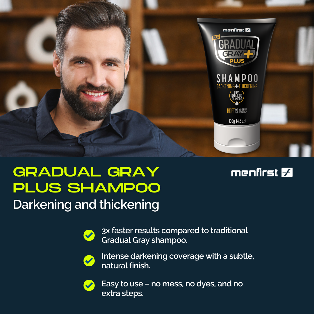 Experience the Power of Gradual Gray PLUS by Menfirst – Designed for today’s confident man, this advanced shampoo works to gently reduce gray hair over time while boosting hair thickness and strength. Powered by innovative darkening and volumizing technology, it delivers practical, effective results with every wash—leaving your hair healthier, fuller, and naturally revitalized.